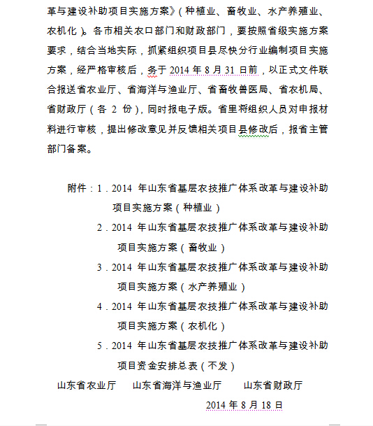 有关市农业局(农委)、海洋与渔业(主管)局、畜牧兽医局、农机局、财政局: 根据《农业部办公厅、财政部办公厅关于做好2014年基层农技推广体系改革与建设工作的通知》(农办财〔2014〕43号),结合我省实际,我们制定了《2014年山东省基层农技推广体系改革与建设补助项目实施方案》(种植业、畜牧业、水产养殖业、农机化)。各市相关农口部门和财政部门,要按照省级实施方案要求,结合当地实际,抓紧组织项目县尽快分行业编制项目实施方案,经严格审核后,务于2014年8月31日前,以正式文件联合报送省农业厅、省海洋与渔业厅、省畜牧兽医局、省农机局、省财政厅(各2份),同时报电子版。省里将组织人员对申报材料进行审核,提出修改意见并反馈相关项目县修改后,报省主管部门备案。