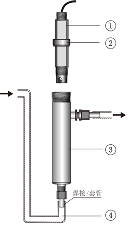 2 连接(如左图所示) 将电极的电缆依次穿过连接套、安装管、套管、管盖和防水头; 将电极的螺纹与连接套的螺纹孔相接并拧紧且需密封处理; 不锈钢连接套则与安装管相连;