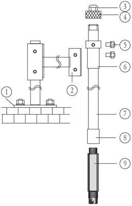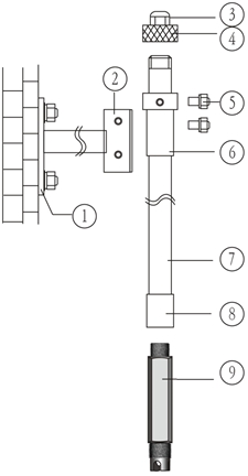 1、底座 2、支架托 3、防水头 4、管盖 5、锁定螺钉M6×10 6、套管 7、安装管 8、连接套 9、电极